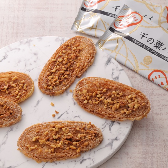 バターの風味豊かなパイ生地に千葉県産落花生と下総醤油で、あとひく美味しさのリーフパイです。下総醤油はプロも選ぶ千葉の美味しいお醤油です。
